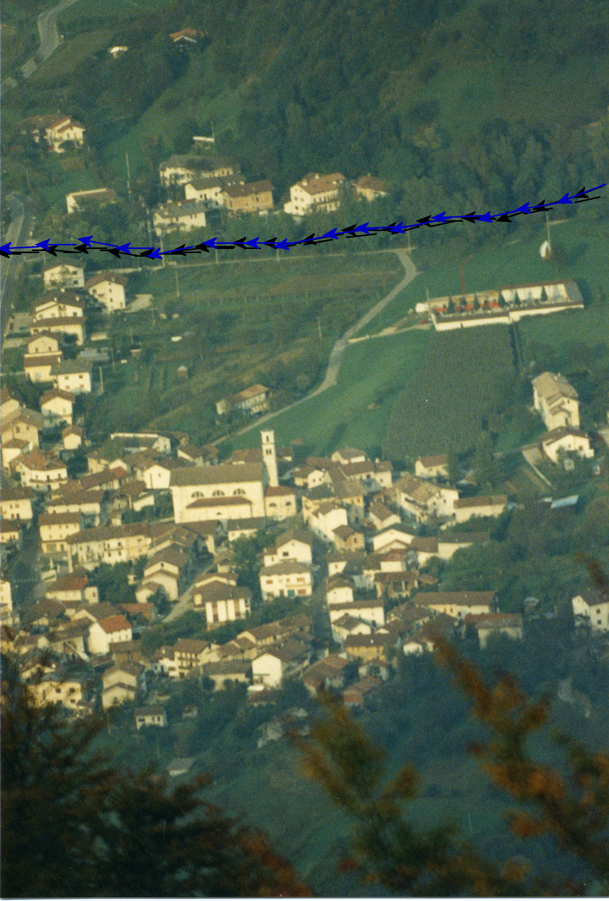 Come infatti si nota nell'immagine a destra, che riprende parte di Rasai dalla cima del M. Roncòn, il tracciato del Biotìs (in corrispondenza delle frecce blu-nere) non è visibile: il torrente scorre in un alveo profondo tre-quattro metri, scavato nel materiale alluvionale e rinforzato con argini.