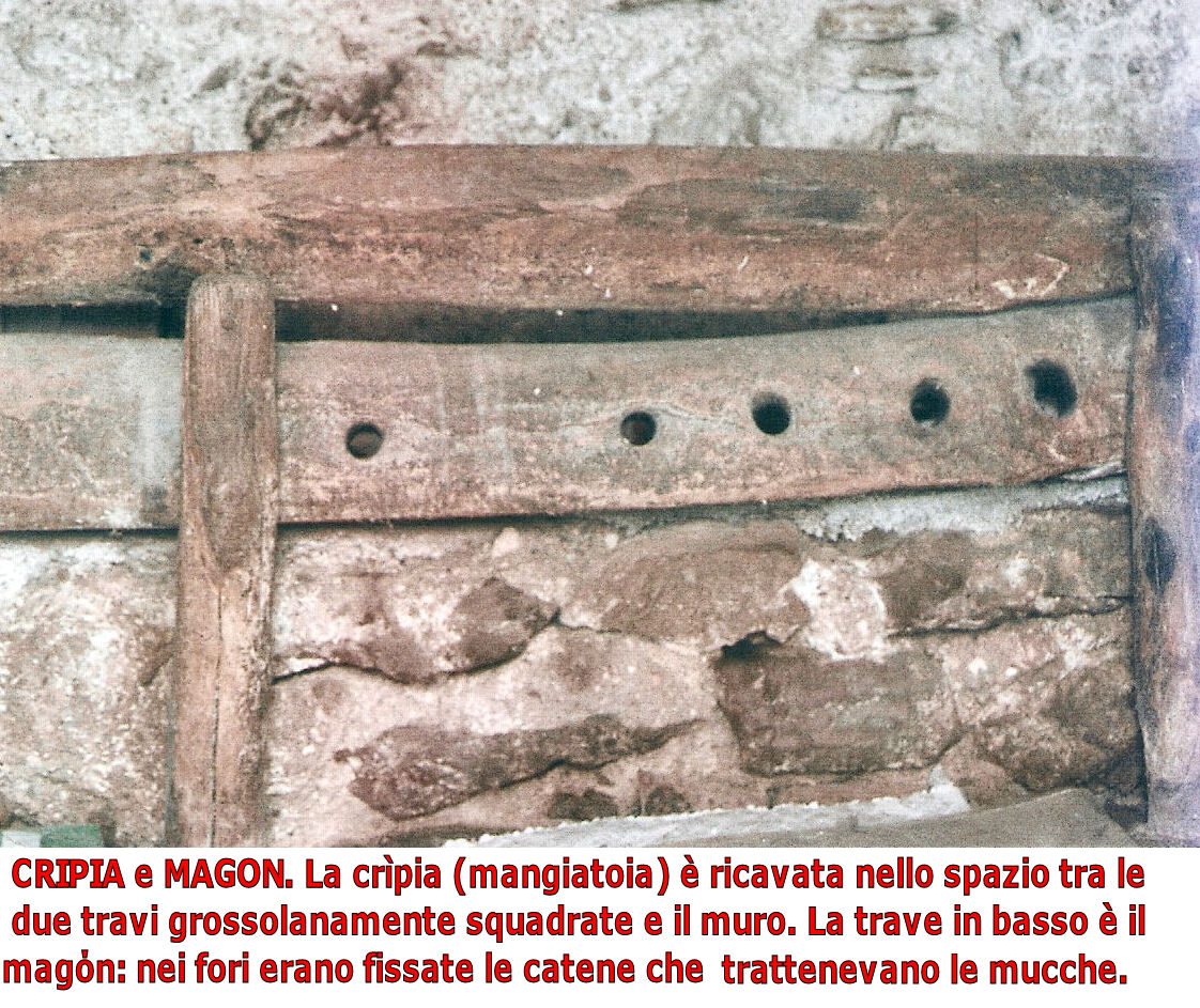 Asse di legno -di solito un robusto castagno opportunamente trattato con l'ascia: spessore di una decina di cm e oltre, altezza almeno una ventina di cm- cui erano incatenate le mucche nelle vecchie stalle; mangiatoia o greppia; il magόn era anche parte della crìpia. Il nome magòn deriva da magone, sofferenza provocata agli animali legati